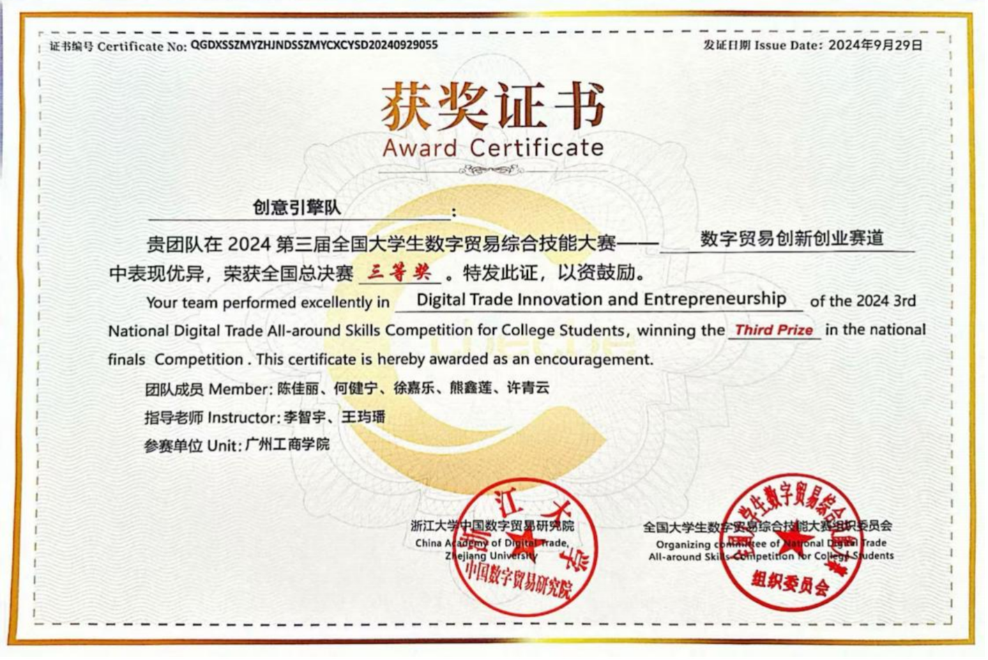 2024年9月26日至29日,由商学院国际经济与贸易教研室陈佳丽、何健宁、熊鑫莲、许青云、徐嘉乐共五名学生组成的创意引擎队,在李智宇、王玙璠老师指导下,前往浙江大学紫金港校区参加第三届全国大学生数字贸易综合技能大赛创新创业赛道全国总决赛,经过激烈角逐,最终荣获国家级三等奖的荣誉!
