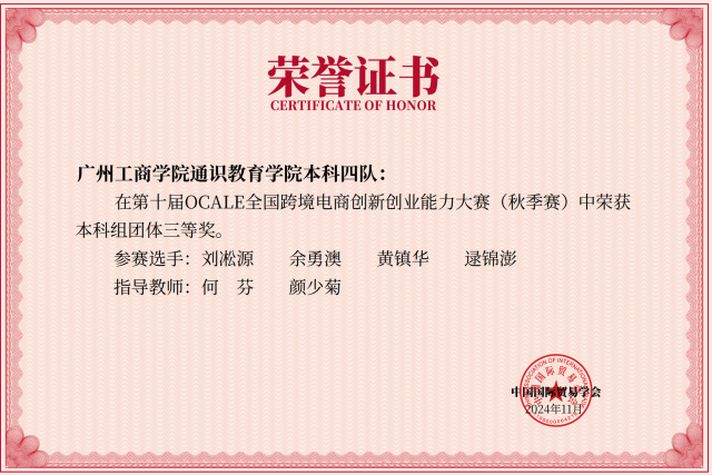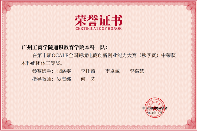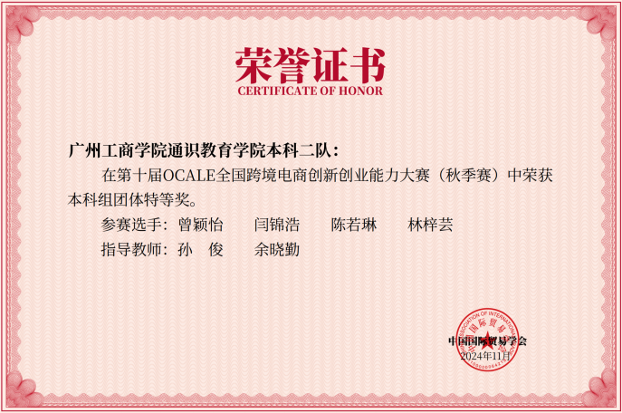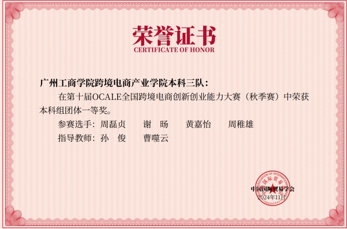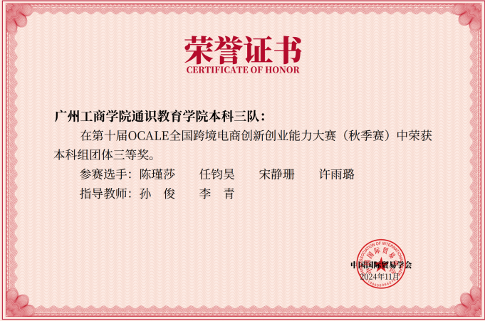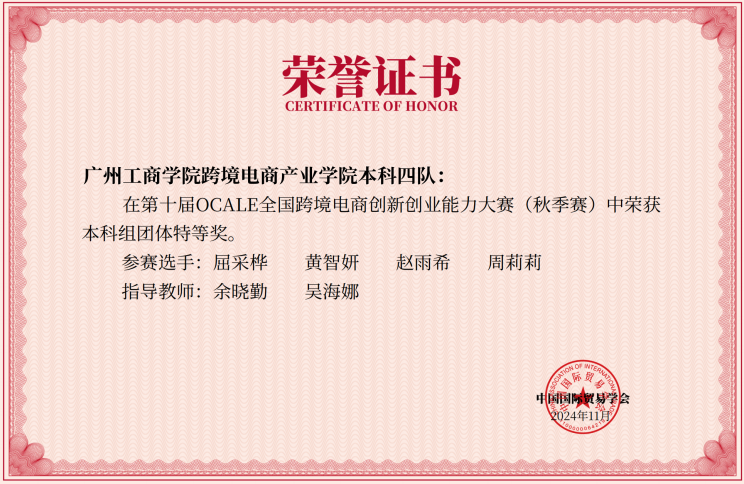 第十届OCALE全国跨境电商创新创业能力大赛(秋季赛)于2024年11月28号晚上八点半圆满结束。跨境电子商务教研室等九支参赛队伍荣获“团体特等奖三项、团体一等奖三项、团体三等奖三项”。