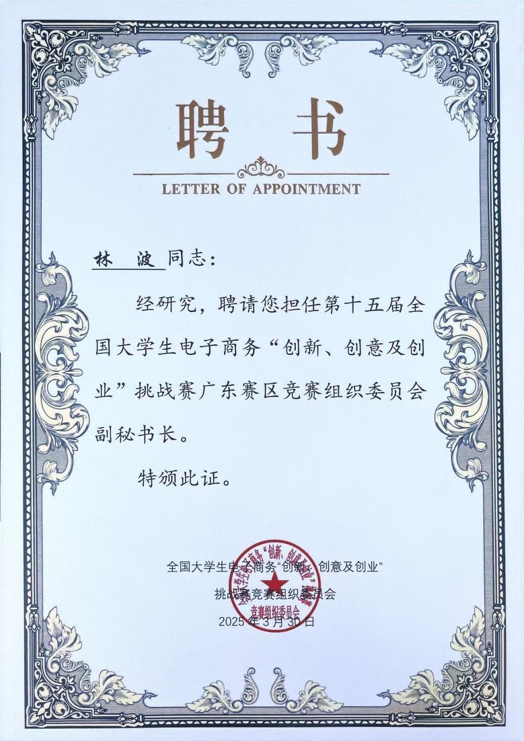 在会议过程中,林波院长被聘为第十五届全国大学生电子商务“创新、创意及创业”挑战赛广东赛区竞赛组织委员会委员及赛事副秘书长。此次ky开元集团官网商学院代表参与培训,将有助于ky开元集团官网更好地组织学生参与即将开展的三创赛校赛,提升学生在电子商务领域的创新、创意及创业能力,为学院在该赛事中取得优异成绩奠定坚实基础。
