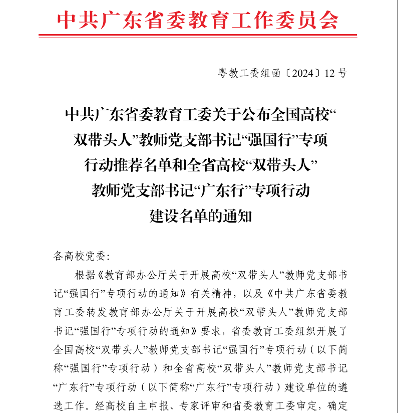 根据教育部和省委教育工委的部署,本次"双带头人"专项行动旨在提升教师党建和思想政治工作质量,培育创建"双带头人"工作室,推动专项行动取得实效。经过高校自主申报、专家评审和省委教育工委审定,我院教工第二党支部从众多申报单位中脱颖而出,成为"广东行"专项行动建设单位之一。