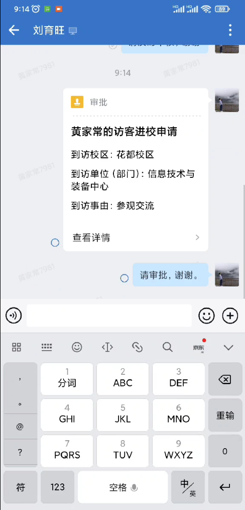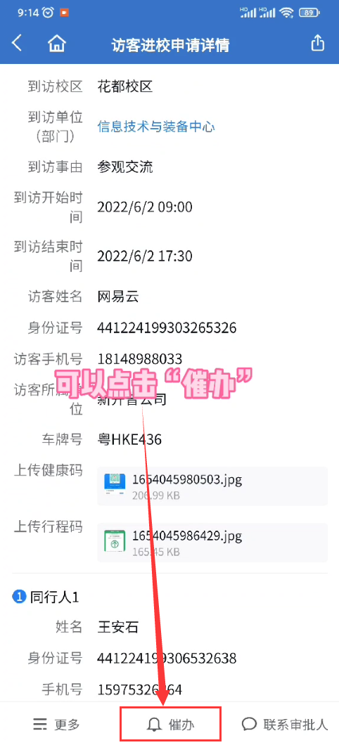 如果审批人没有审批,可以点击“联系审批人”,给审批人发信息,提醒他审批。