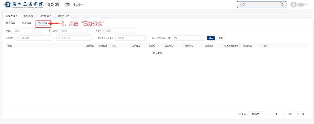登录融合服务门户,点击-“公文处理”,点击-“已办公文”即可找到公文审批记录,如图所示: