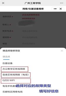 (电信)或GZGSWIFI,填好宿舍楼和宿舍号,描述故障最后提交