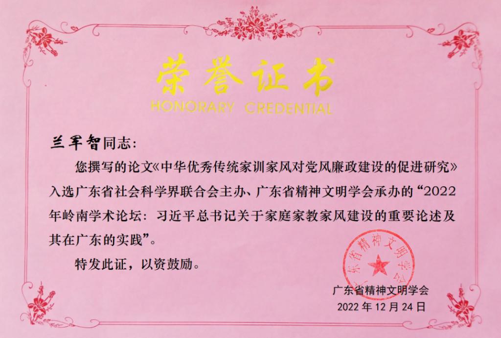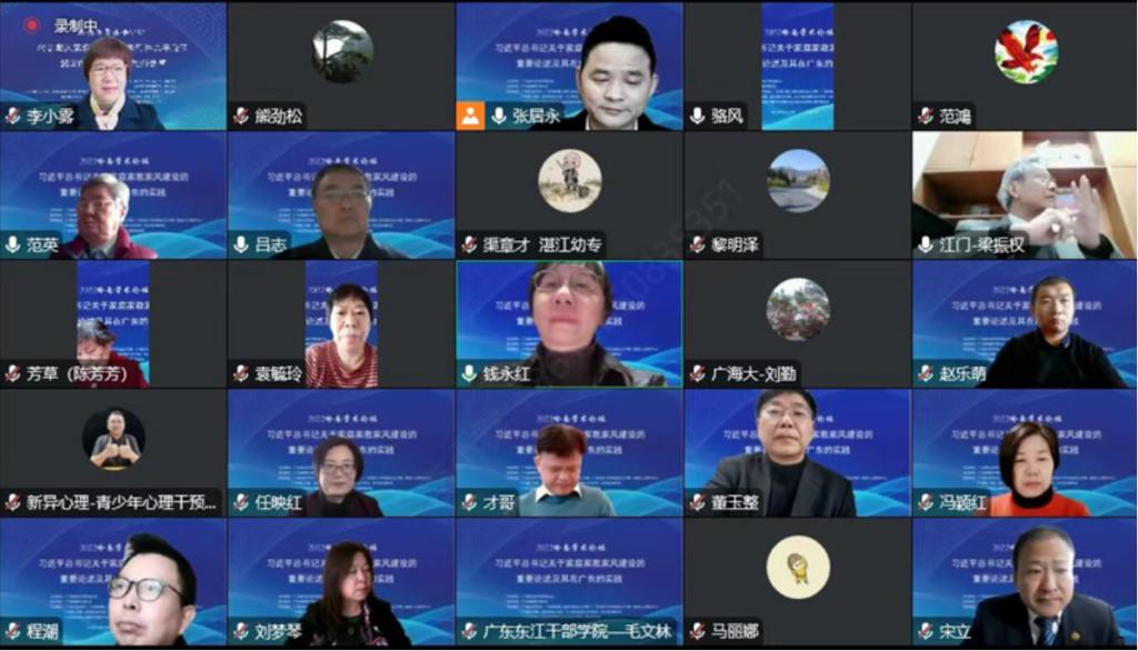12月24日,2022年岭南学术论坛“习近平总书记关于家庭家教家风建设的重要论述及其在广东的实践”学术研讨会在广州通过腾讯会议的方式在线举行。本次论坛由广东省社会科学界联合会主办,广东省精神文明学会承办、广东社会学学会等7家单位联合协办。广东省社会科学界联合会一级巡视员钱永红、广东省社科联顾问、广东省精神文明学会和广东社会学学会终身名誉会长范英研究员、广东省精神文明学会会长吕志教授、广东社会学学会会长董玉整研究员等出席,来自广东省党政机关、高等院校、企事业单位的近300名专家学者通过线上方式参加了论坛。ky开元马克思主义学院教师兰军智应邀参加了本次论坛。