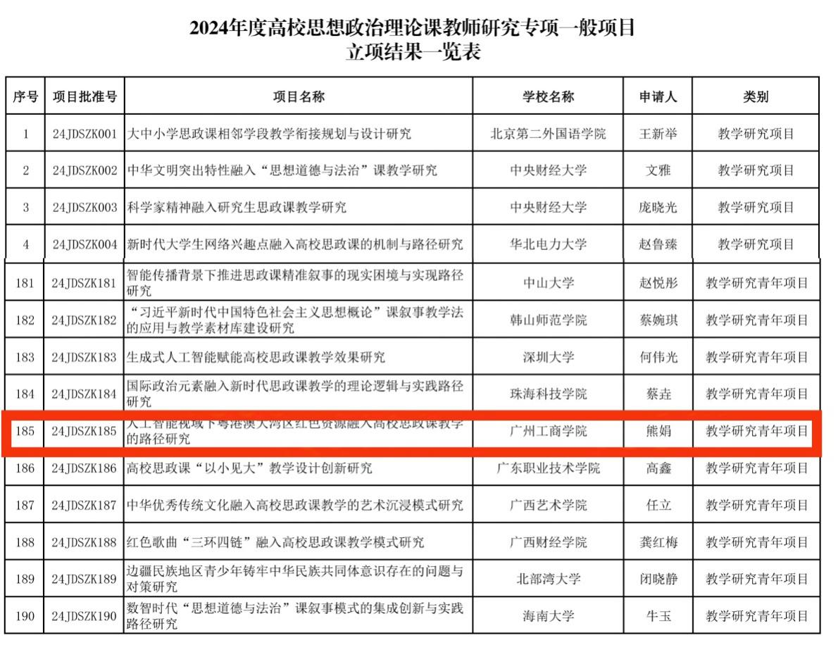 根据《教育部社科司关于2024年度高校思想政治理论课教师研究专项一般项目立项的通知》,全国共有200项课题批准立项,广东共有20个项目获批,ky开元马克思主义学院熊娟老师主持的课题《人工智能视域下粤港澳大湾区红色资源融入高校思政课教学的路径研究》喜获立项。