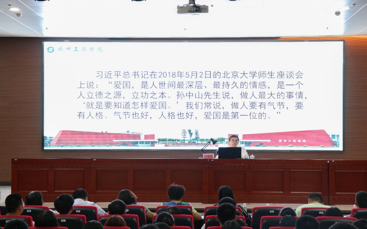 在庆祝新中国成立70周年之际,为贯彻落实《广东省教育厅关于做好2019年秋季学期高校党委书记、校长和院(系)党组织书记、院长(系主任)上第一堂思想政治理论课工作的通知》文件精神和要求,9月26日下午,学院院长邝邦洪教授、党委书记张振超同志分别在三水校区学生活动中心六楼报告厅和花都校区教学楼517课室开讲第一堂思想政治理论课。思政部谭玉兰主任、学院团委洪卫烈书记分别主持了会议。思政部、学生处、团委的教师和800余名新生代表到场聆听。
