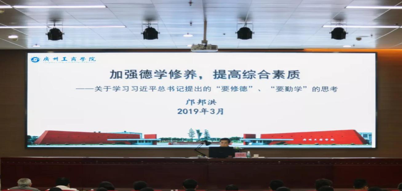 邝院长以《加强德学修养,提高综合素质——关于学习习近平总书记提出的“要修德”、“要勤学”的思考》为主题,从社会、家庭、自身三个方面讲述了加强道德修养的重要性,要求大学生牢记习近平总书记所说的“明大德,守公德,严私德,立志高远,立足平实,报效祖国,服务人们”的教导,成为有理想、有道德、有文化、有纪律的德、智、体、美、劳全面发展的社会主义接班人。同时,通过社会案例和我院的志愿活动(如:探访敬老院,三下乡活动,义务献血,广州志愿驿站)要求大学生要加强道德修养的实践性,知行并举,自我反思;持之以恒,修德不懈,做社会主义核心价值观的模范榜样和践行者。并通过名人案例针对“勤学”向我们提出了“要珍惜时间,刻苦学习”的要求,为同学们总结和分享了泛读法、资料性阅读、欣赏性阅读和研究性阅读四种读书方法。邝院长的讲授平易近人、旁征博引、正能量满满,引发了现场师生的强烈共鸣和阵阵掌声。同学们纷纷表示,听了邝院长的讲座感受颇深,受益匪浅,今后一定会加强自身的“德学”修养,努力做一个全面发展的优秀大学生,实现自己的人生价值。
