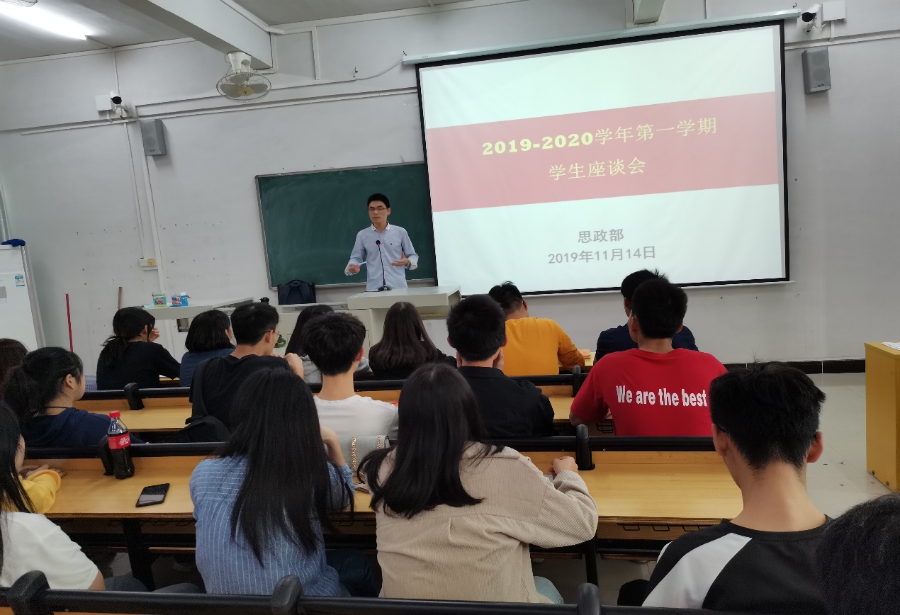 为了广泛听取本学期学生对思政课教学的意见,促进师生教和学进一步沟通,提高教学质量和加强学风建设,思政部于11月14日下午在三水校区第一教学楼D503召开了2019-2020学年第一学期期中学生座谈会,来自各系的41名学生代表参加座谈会。座谈会由思政部“思想道德修养与法律基础”课教研室主任周志鹏老师主持。