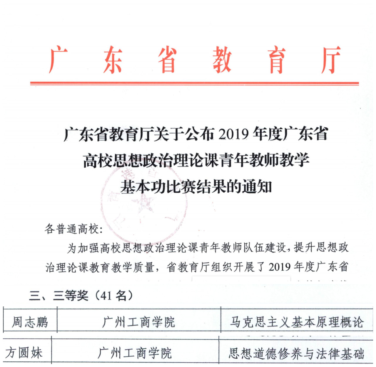 11月25日,广东省教育厅正式公布了高校思政课“精彩一刻”教学基本功比赛获奖名单,思政部教师方圆妹、周志鹏分别荣获“思想道德修养与法律基础”与“马克思主义基本原理概论”组别三等奖。
