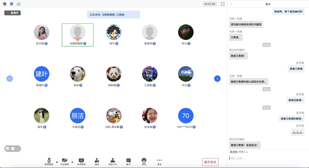 随后,教研活动进行了科研工作答疑环节。彭艺格、张赫等青年教师十分积极地向与会的教授们请教科研论文的写作方法、如何查阅前沿研究成果等问题,王晓平教授、范金良教授有针对性地进行了解答。教授们为青年教师的谦虚好学、积极进取所感动,答疑时滔滔讲“术”、倾囊相授,尤其是王晓平教授的答疑,精准利落、深入透彻,在线的青年教师们纷纷竖耳恭听,频频点头,茅塞顿开……整个科研交流过程氛围十分热烈、活跃且充实。