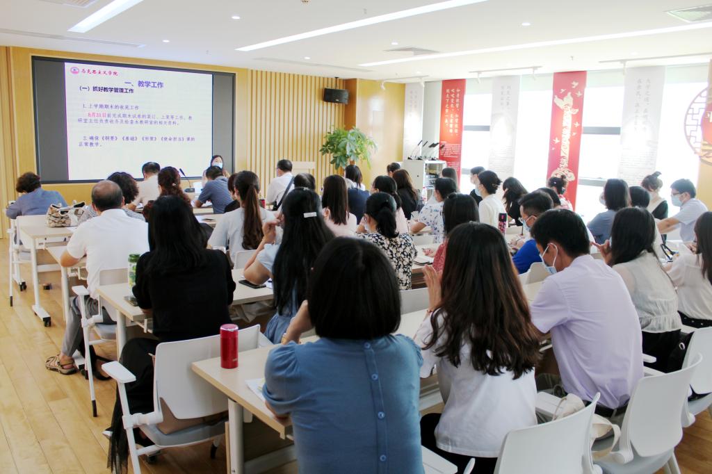最后,张辉副校长就新学期工作提出五点要求。一是做到尽职履责。思政课是高等学校落实立德树人根本任务的关键课程,是必须按照国家要求设置的课程。作为思政课教师,首要岗位职责是通过以教学内容为主、教学方法为辅,丰富教学手段的方式,讲好思政课。二是不断加强学习。思政课教师应当不断学习专业理论及各类知识,完善知识结构,紧跟时代发展的需要和大学生成长成才的需要。三是必须守住底线。教师应自觉遵守教学纪律和校纪校规,时刻牢记《新时代高校教师职业行为十项准则》,明确高校教师职业道德规范,守住基本底线,做师德师风建设的模范。四是提升自身修养。张副校长强调,“静坐常思己过,闲谈莫论人非”,教师应当学会换位思考,时常自我反省,真正做到爱岗敬业、与人为善,团结协作,凝心聚力为学校发展、为学生成才服好务。五是增强危机意识。目前,学校发展需要大量高质量高水平人才,马院教师必须具备危机意识,未雨绸缪,不懈努力,才能更好地实现自我价值。