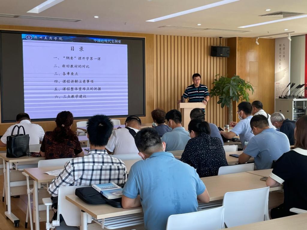 王麒主任主要从开学第一课、新旧教材对比、各章节要点、课程讲解注意事项、课程重难点把握、教学建议六大方面展开详细讲解。首先,结合上级部门文件精神,王主任强调开学第一课务必强化大学生疫情防控意识,共同打造安全健康校园。其次,本学期启用2021版最新版教材,他将新旧教材目录对比,并指出各章讲课要点。再次,他提醒老师们上《纲要》课过程中,要注意体现的是思政课而非历史课,不要过多讲细节、讲事件、讲人物,要落脚于“四个选择”;注重教学内容的选取,理清教学思路,注重教学内容的完整性;注重教学方法的拓展,丰富课堂教学环节等事项。然后,他对《纲要》课的重难点给以定位,紧扣近代中国两大历史任务,讲清近代中国各个阶层在完成这两大任务上的种种尝试;运用比较法,讲清中国共产党完成两大历史任务的方案同其他阶层所提出方案的异同,帮助大学生更加深刻地理解“四个选择”的历史必然性;重点讲好新中国史和改革开放史,帮助大学生更好地领悟新时代。最后,他提出三点教学建议,在教学过程中,可适当添加与教学内容相关的乡土历史资源,对大学生进行国情、省情教育;注意结合社会实际问题,搭建历史与现实联系的桥梁,帮助大学生理解学好《纲要》课的重要意义;注意在教学过程中融入习近平总书记在庆祝中国共产党成立100周年的讲话精神。