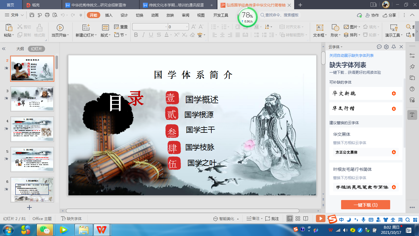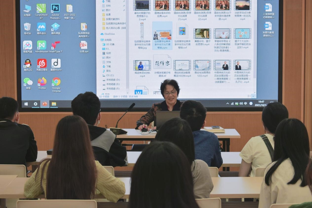 唐晓燕副教授则在会上分享了两个方面的内容:一是强调了学习中华优秀传统文化的意义尤其是它的当代价值;二是就《国学体系》的大致框架进行了简短的介绍。她强调,中国传统文化博大精深,蕴含着丰富内涵,不仅有“穷则独善其身,达则兼济天下”的济世情怀,还有“天下兴亡,匹夫有责”的社会责任,还有“修身齐家治国平天下”的人生取向和“天人合一”的终极理想。学习研究中华优秀传统文化对于增强文化认同和文化自信,提高道德水准和道德素养具有重要的作用和意义。