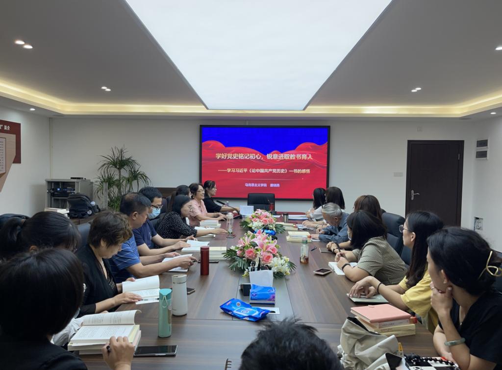 【本网讯】为庆祝中国共产党成立100周年,深入学习贯彻习近平总书记“七一”重要讲话精神,推动党史学习教育走深走实,10月14日下午,马克思主义学院教师第一党支部在张辉名师工作室召开“学好党史铭记初心,锐意进取教书育人——学习习近平同志《论中国共产党历史》一书的感悟”党史学习教育学习分享会。党支部书记唐晓燕副教授主持分享会并领学,党支部全体党员参加。