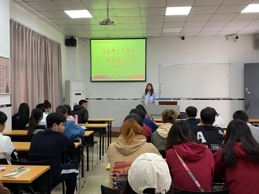 【本网讯】为积极践行学校“德学”教育思想和“五进”教育实践活动,进一步加强教与学之间的沟通,广泛听取本学期学生对思政课的教学意见及建议,提高教学水平和教学质量,11月25日下午,马克思主义学院在花都校区教学楼105召开2021-2022学年第一学期学生座谈会。马克思主义学院专任教师施蒙、李志敏及40余名学生代表参加此次会议。