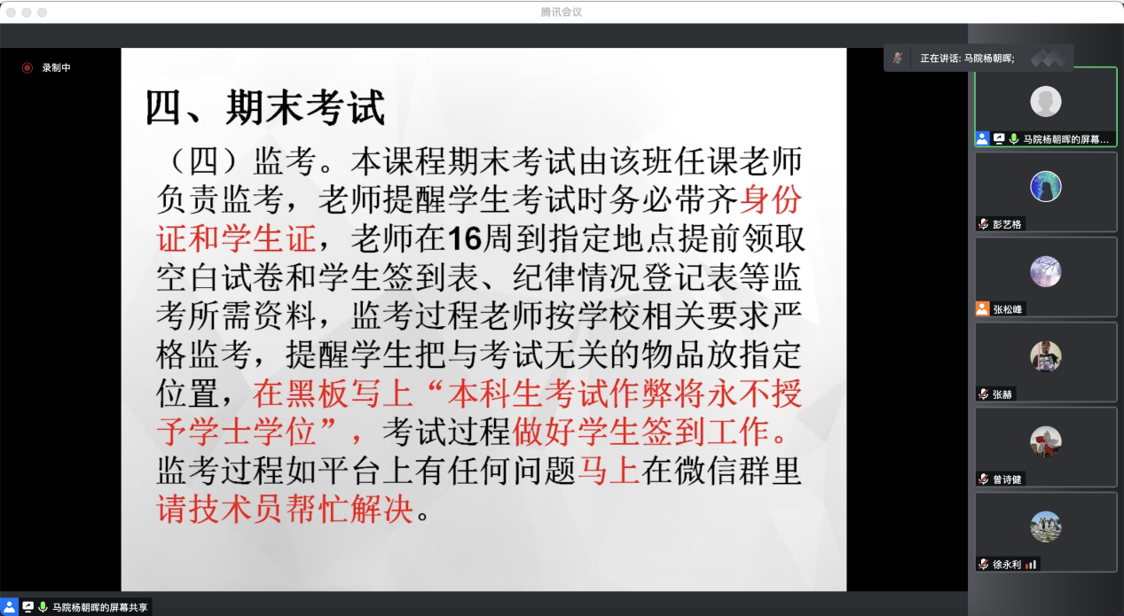 此次线上期末工作部署会议,对于各位任课教师以高标准、严要求抓好考场纪律,以高质量、高效率执行期末考试前后的各项工作,营造风清气正的育人环境,持续提升教育教学质量具有现实意义。(马克思主义学院通讯员:李雨 谭丽婷,摄影:彭艺格)