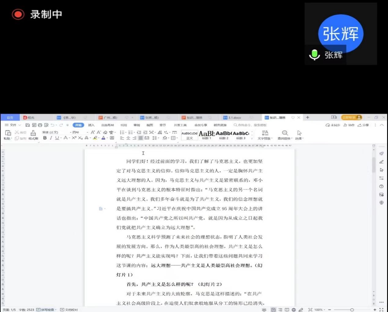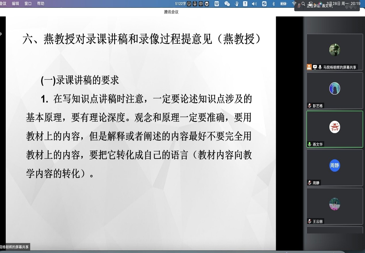 项目组负责人副校长张辉教授就录课讲稿与脚本写作以及PPT制作等问题与各位老师进行了分享与交流,细致答复了录课教师关于录课内容的一些疑问。她表示,微课录制工作是省级在线开放课程的重点工作,时间紧、任务重,希望大家本着高标准、严要求的原则,集思广益、精益求精,共同圆满完成省级在线开放课程的录课工作,以进一步推动思政课教学改革创新,促进思政课教学质量的不断提升。