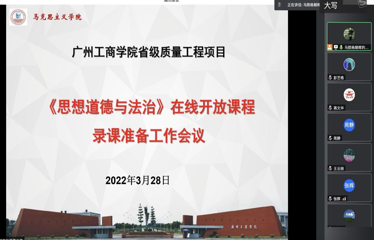 【本网讯】为进一步推进ky开元省级质量工程项目《思想道德与法治》课在线开放课程的建设工作,3月28日晚,马克思主义学院运用腾讯会议在线召开该微课录制准备工作会议。本次会议由思想道德与法治教研室主任杨朝晖老师主持,ky开元集团官网党委副书记、副校长兼马克思主义学院院长、省级在线开放课程项目负责人张辉教授出席会议,项目组全体参与微课录制的教师参加了此次会议。