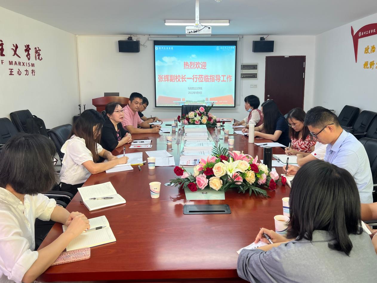 【本网讯】为深入了解马克思主义学院学科建设(硕士点培育)工作的开展情况,9月9日上午,副校长张辉教授带领科研处、校重点学科建设领导小组办公室相关领导及工作人员深入马克思主义学院进行调研,并开展了座谈交流。马克思主义学院常务副院长周静副教授、教研室主任、科研秘书等人员参加了调研。