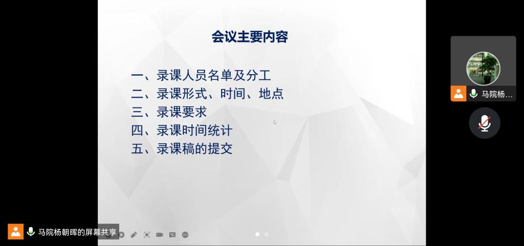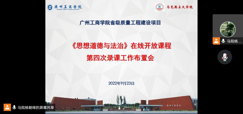 【本网讯】新学期广东省在线开放课程《思想道德与法治》录课工作在即,为保证录课质量,进一步落实录课工作任务,9月23日晚,马克思主义学院思想道德与法治教研室通过腾讯会议召开了本课程第四次录课工作部署会。会议由教研室主任杨朝晖老师担任,承担《思想道德与法治》录课任务的全体教师参加了此次会议。