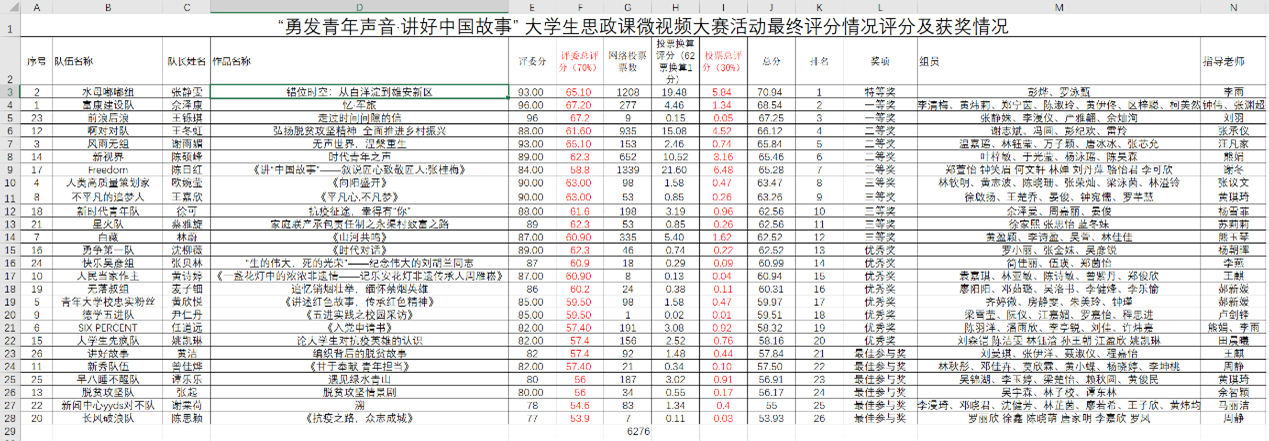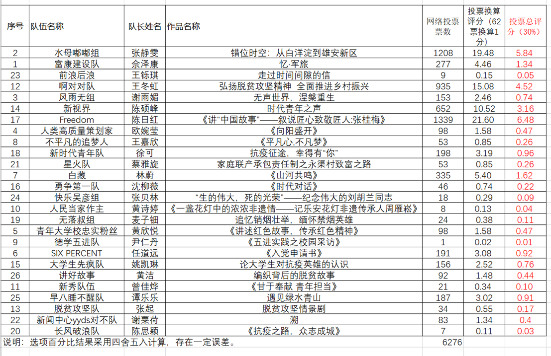 经初步筛选,共有26份视频类作品进入到线上展示与投票环节。12月4日-12月11日,入围的26份作品在马院微信公众号进行公开线上展示及投票,最终获得有效票为6276票。