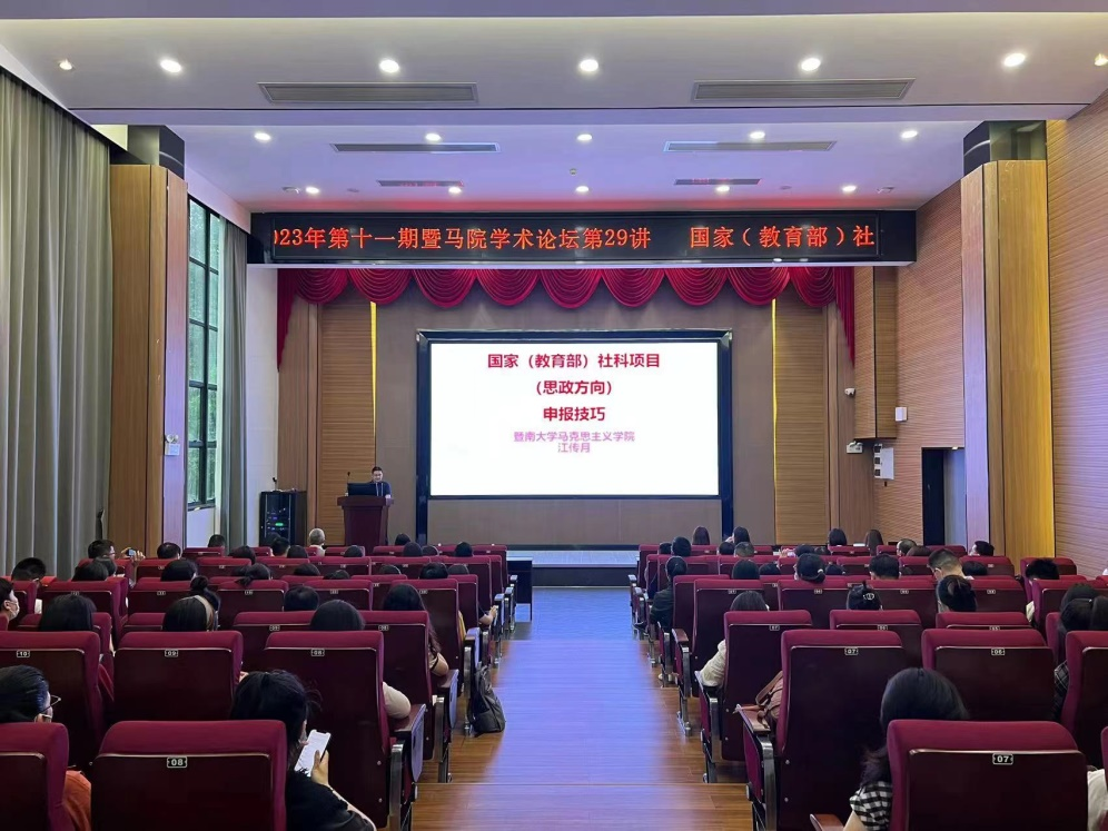 为推动学校科研工作新突破,增强学校思政工作队伍的科研创新能力,提高青年教师高水平思政类课题申报质量,4月21日下午,由ky开元集团官网科研处、学生处、马克思主义学院和张辉名师工作室联合主办的工商大讲堂2023年第十一期暨马院学术论坛第二十九讲在花都校区图书馆415报告厅举行。本次讲座由暨南大学马克思主义学院江传月教授主讲,题为“国家(教育部)社会科学基金(思政方向)申报技巧”。马克思主义学院全体教师、辅导员代表、张辉名师工作室成员积极参与现场培训。会议由科研处副处长徐波老师主持。