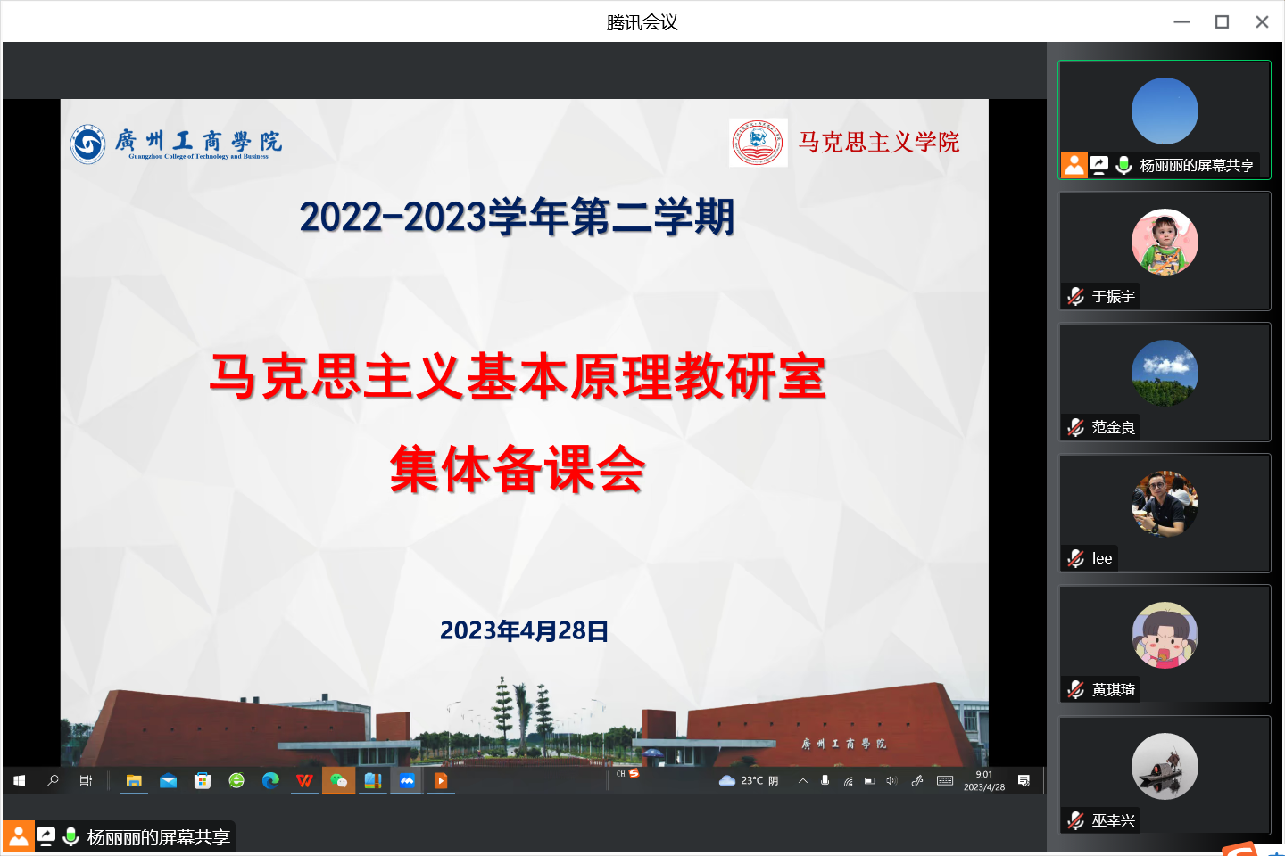 为进一步提升教学质量,推动教研室建设与课程建设,4月28日上午9时,马克思主义基本原理教研室于线上召开本学期第二次集体备课会。会议由教研室主任杨丽丽老师主持,承担马克思主义基本原理课程的全体教师参会。
