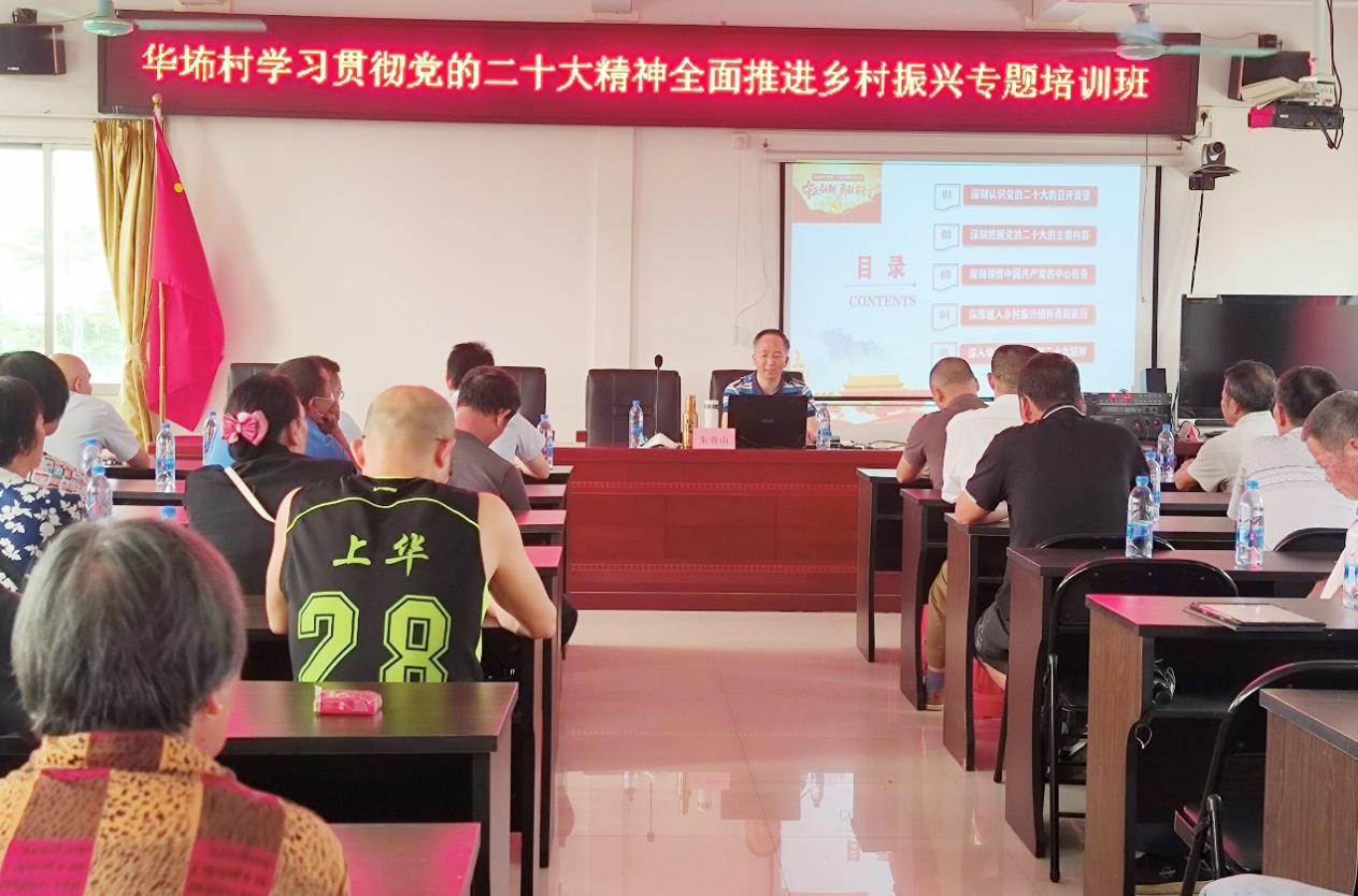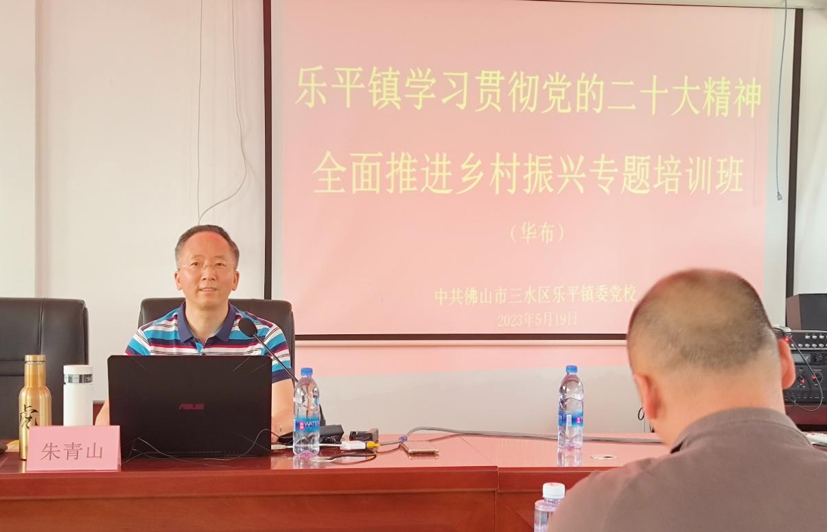 为全面学习宣传贯彻党的二十大精神,深入开展学习贯彻习近平新时代中国特色社会主义思想主题教育,发挥农村党员在乡村振兴中的“领头雁”作用,进而建设宜居宜业和美乡村。ky开元集团官网马克思主义学院党总支与佛山三水区乐平镇委党校协同组织开展了“学习贯彻党的二十大精神,全面推进乡村振兴”专题培训班。马克思主义学院宣讲团专家朱青山副教授应邀于5月19日深入佛山市三水区乐平镇华布村村委开展了《以中国式现代化推进中华民族伟大复兴——党的二十大精神解读》为题的党的二十大精神专题讲座。