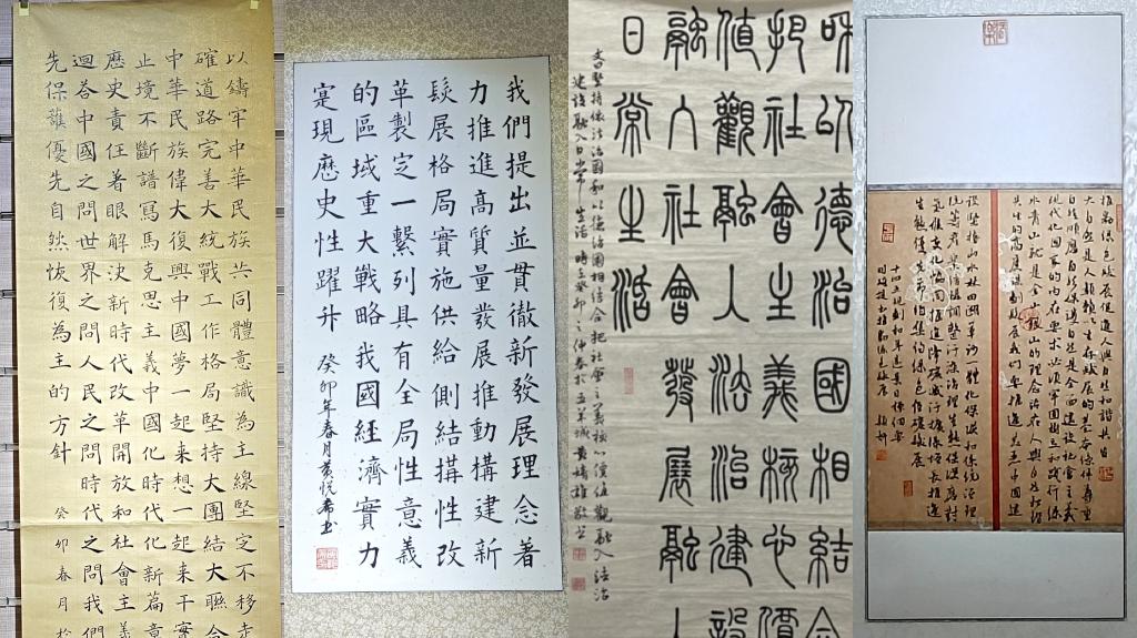 此次书画艺术作品大赛的参赛者围绕“翰墨丹青写初心,踔厉奋发谱华章”主题,以党的二十大报告金句为创作内容展开创作。大赛分为书法、绘画及工艺三大类作品进行评比。师生参赛热情高涨,在作品征集阶段,共收集到硬笔313份,毛笔63份,绘画46份,手工17份,共计收集各类作品四百余件(幅)。