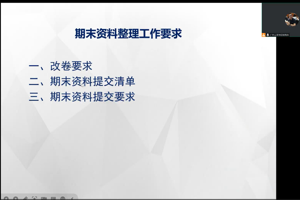 接着,杨主任对期末教学资料提交清单逐项、逐字、逐句进行了细致的解读,对每一项材料的质量要求、提交数量、提交时间、提交方式等都进行详细的说明,使期末资料的整理和归档工作有章可循,有据可依。