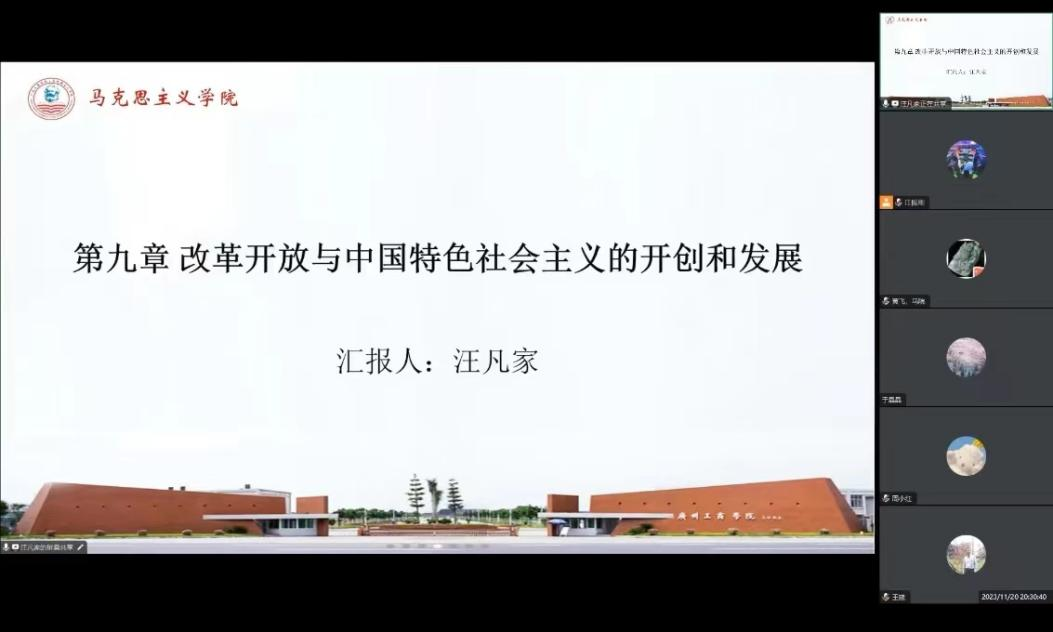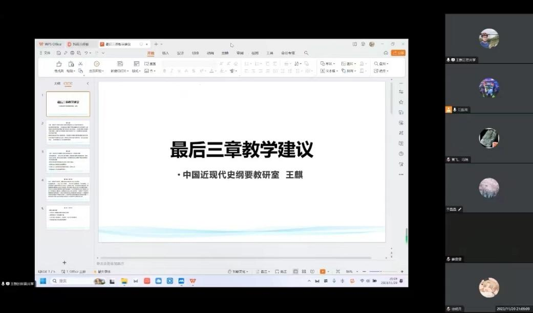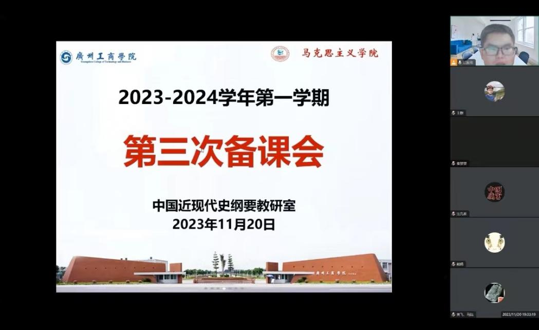 为进一步提高思政课教学质量,营造良好教学研究氛围,推动教研室建设与课程建设。11月20日晚,马克思主义学院中国近现代史纲要教研室以腾讯会议的形式召开了秋季学期第三次“中国近现代史纲要”课程集体备课会,本次备课会由教研室主任江振刚老师主持,全体任课老师参加。