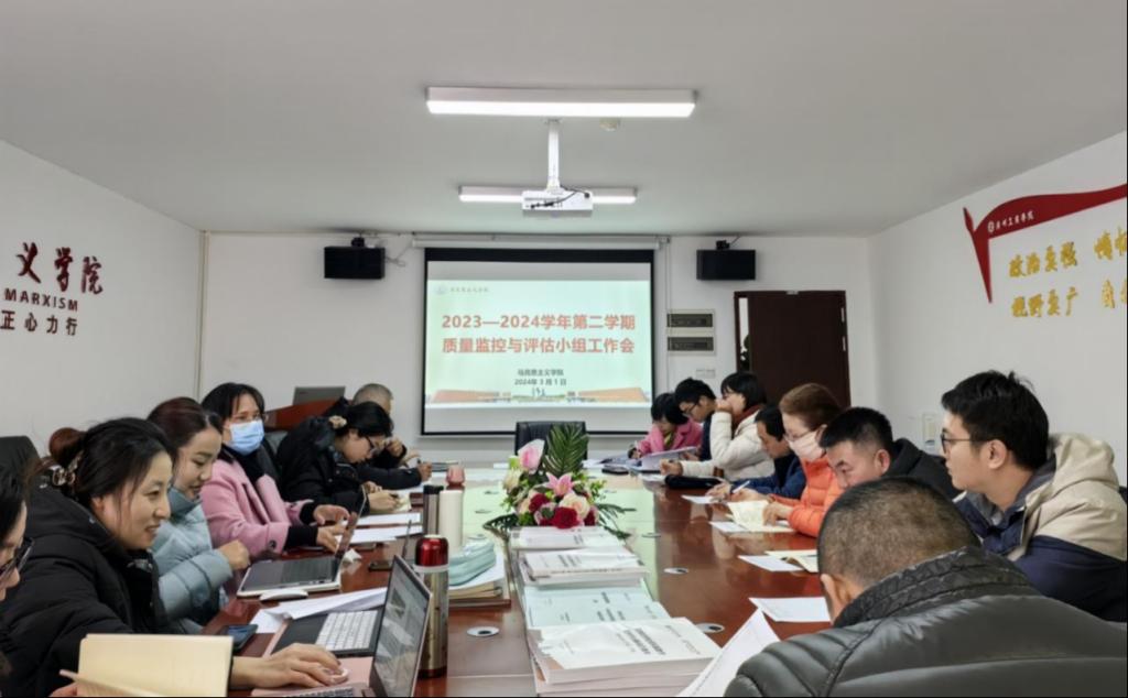 为深入贯彻落实党的二十大关于社会主义现代化建设的教育战略部署,深化教育教学改革创新,科学诊断教学效果,调整改进教学策略,完善教学质量监控体系,全面推进学院各项事业的高质量发展,加强学院教学质量管理,3月1日下午,马克思主义学院在三水校区院部楼424会议室召开2023-2024学年第二学期质量监控与评估小组工作会议,马克思主义学院党总支书记、常务副院长周静副教授出席会议并讲话,会议由马克思主义学院副院长黄飞副教授主持,质量监控与评估小组的全体教师参加会议。