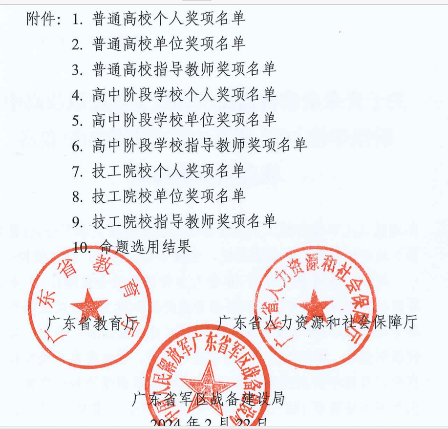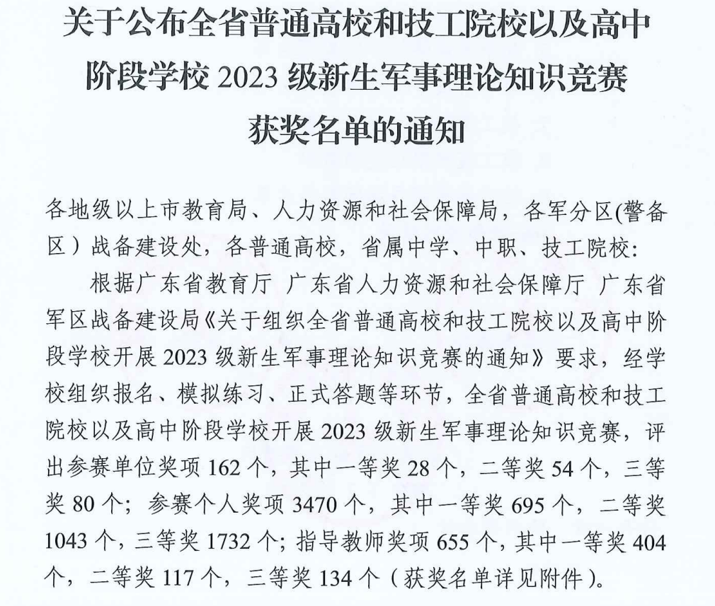 根据《关于组织全省普通高校和技工院校以及高中阶段学校开展2023级新生军事理论知识竞赛的通知》安排,近日,广东省教育厅、广东省人力资源和社会保障厅、广东省军区战备建设局公布了2023级新生军事理论知识竞赛的获奖结果,ky开元荣获普通高校二等奖,十名同学荣获一等奖、七名同学荣获二等奖,八名同学荣获三等奖,ky开元军事理论课程教研室穆松、胡刚两位老师荣获指导教师一等奖,获奖名次与获奖数量再创新高。