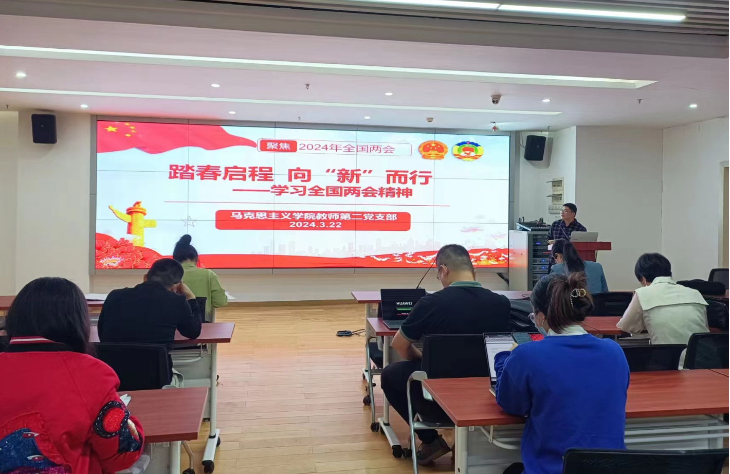 3月4日至11日,2024年全国两会在北京顺利召开,代表们积极建言献策,引起社会广泛关注。为加强对两会精神的学习宣传,3月23日下午,马克思主义学院第二党支部在三水校区院部楼525会议室开展第一议题学习暨主题党课,主题是“踏春启程 向‘新’而行——学习全国两会精神”。学习活动由支部书记巫幸兴副教授主讲,支部全体党员参会。