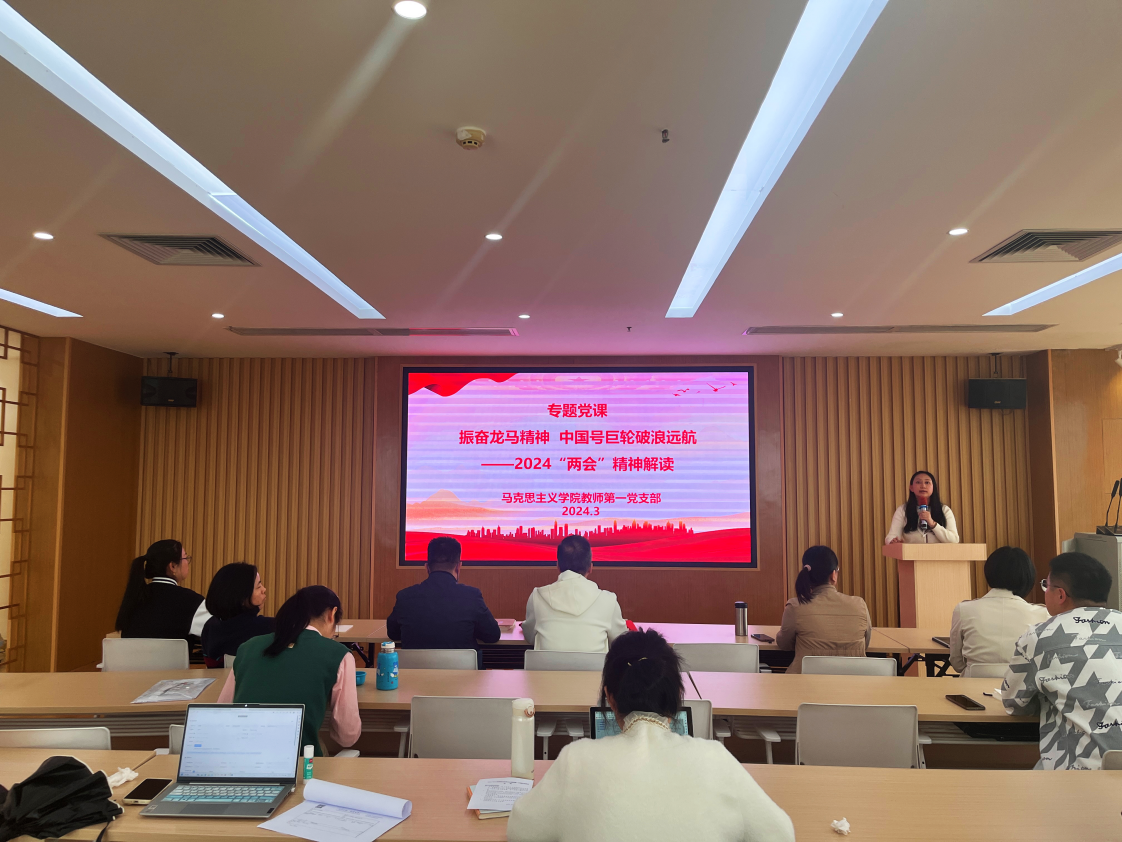 接着,由支部书记王云丽副教授进行《振奋龙马精神,中国号巨轮破浪远航——2024“两会”精神解读》专题党课讲授。王云丽书记从“2023年工作回顾”、“2024年经济社会发展总体要求、政策取向和主要任务”、“学习领会习近平总书记“两会”重要指示”展开,给大家上了一堂主题鲜明、内涵深刻、针对性强的党课。今年全国两会是在迎接新中国成立75周年之际、实现“十四五”规划目标任务的关键之年召开的重要会议。习近平总书记在两会期间先后发表重要讲话,深入总结过去一年工作,对发展新质生产力、全面深化改革、推动科技创新、加强生态保护、促进强军建设等工作,提出明确要求,为推进中国式现代化进一步指明方向。王云丽书记强调,党员教师要深刻领会和把握过去一年我国经济社会发展取得的来之不易成绩,更加自觉坚定拥护“两个确立”、增强“四个意识”、坚定“四个自信”、做到“两个维护”,进一步提高理论水平和业务能力,扎实做好本职工作,做改革发展、开拓创新的积极推动者和践行者。