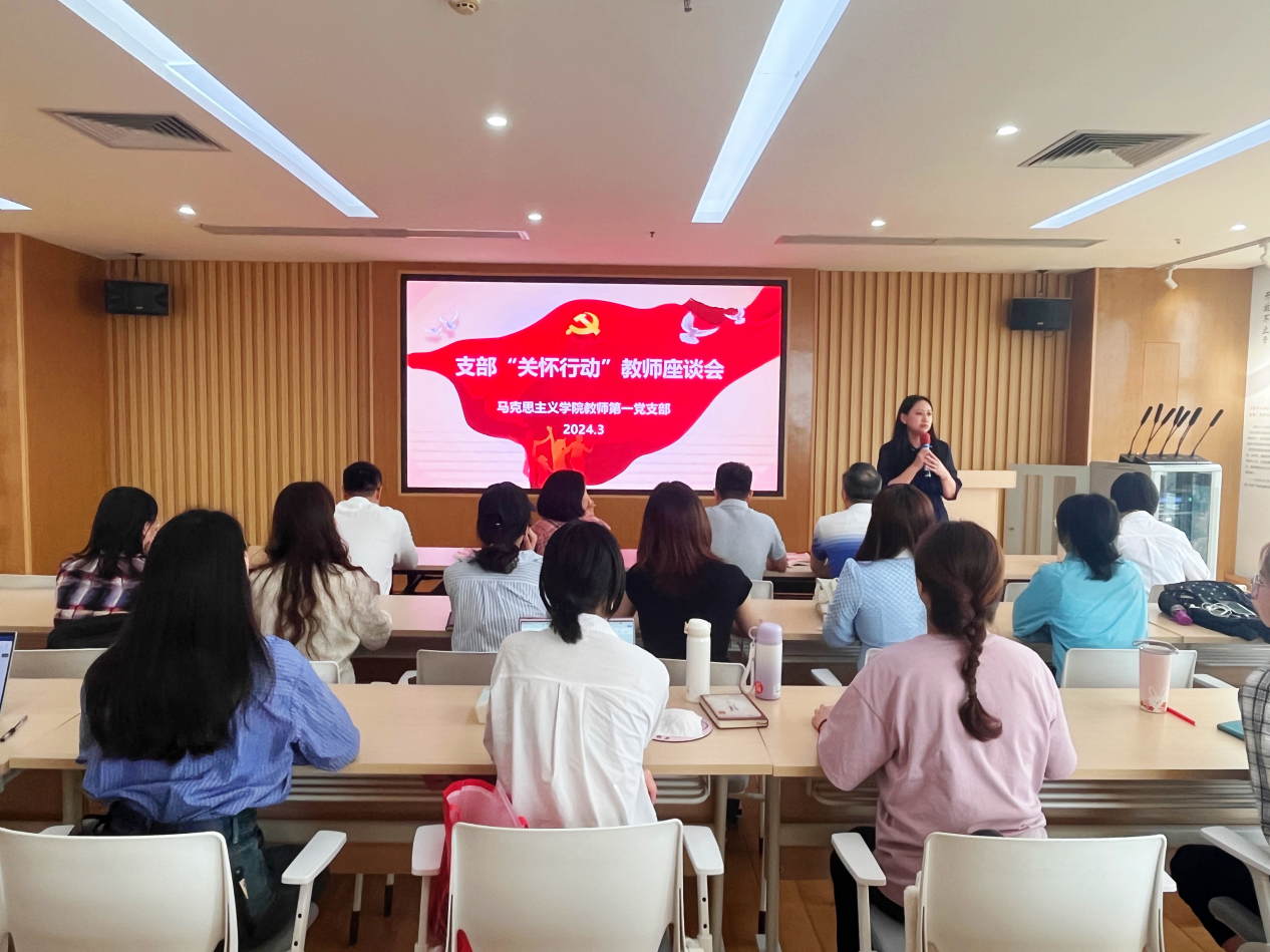 为充分发挥基层党组织凝聚人心、促进和谐的作用,更好地了解新入职教师的工作生活,增强教师的幸福感、认同感,营造团结奋进的良好氛围,3月29日下午,马克思主义学院教师第一党支部在三水校区图书馆六楼新时代讲习所开展支部“关怀行动”教师座谈会。支部全体教师参加了此次座谈会,会议由支部书记王云丽副教授主持。