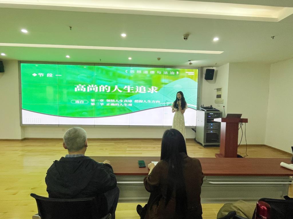 随后进入展示与分享环节。宁老师以“高尚的人生追求”为主题,给老师们带来了一堂内容生动、思想深刻的思政课。宁老师从理论逻辑、历史逻辑、价值意蕴三个方面对服务人民和奉献社会的人生追求进行深入剖析,授课过程中充分引经据典,通过形式多样的教学设计与方法,引人入胜,体现了“合作、探究、互动、评价”的教学模式,突出了以学生为中心的教学理念,达到了较好的教学效果。