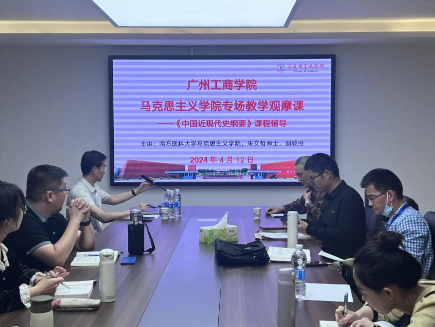 为进一步推动《中国近现代史纲要》课程的发展建设,帮助思政课教师站稳站好讲台,更好服务学院学科建设目标及发展要求,2024年4月12日下午,马克思主义学院在三水校区图书馆402张辉名师工作室开展《中国近现代史纲要》课程专场教学观摩课,本次观摩课邀请了南方医科大学马克思主义学院朱文哲副教授进行专题辅导,马克思主义学院副院长黄飞副教授主持,本学期主讲《中国近现代史纲要》课程的全体教师参加。