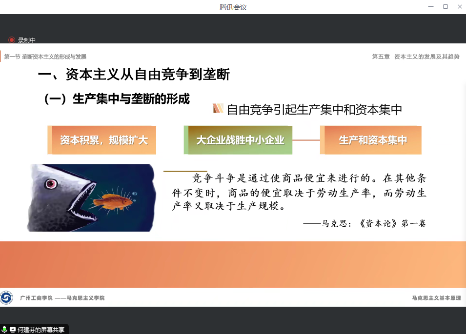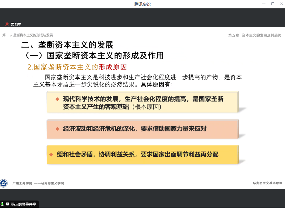 巫幸兴副教授对第五章第一节第二目《垄断资本主义的发展》进行教学展示。巫教授通过问题链导入新课,阐释了国家垄断资本主义的形成与作用、金融垄断资本的发展、垄断资本向世界范围的扩展等垄断资本主义的实质。巫教授理论功底深厚,授课逻辑条理清晰,课程内含丰富的互动及视频、案例分析,展现了他扎实的教学基本功、深厚的专业知识和独特的教学风格。