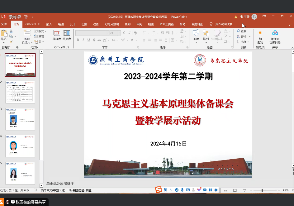 为加强思政课主渠道主阵地建设,充分发挥骨干教师的引领、示范作用,进一步提升《马克思主义基本原理》课程的教学质量,提高教师团队的教学水平,增强第一轮磨课效果。2024年4月15日晚19:30,马克思主义学院马克思主义基本原理教研室通过线上腾讯会议召开了集体备课会暨教学展示活动。本次备课会由马克思主义基本原理课程助理张丽薇老师主持,本学期担任马克思主义基本原理的全体教师参加。