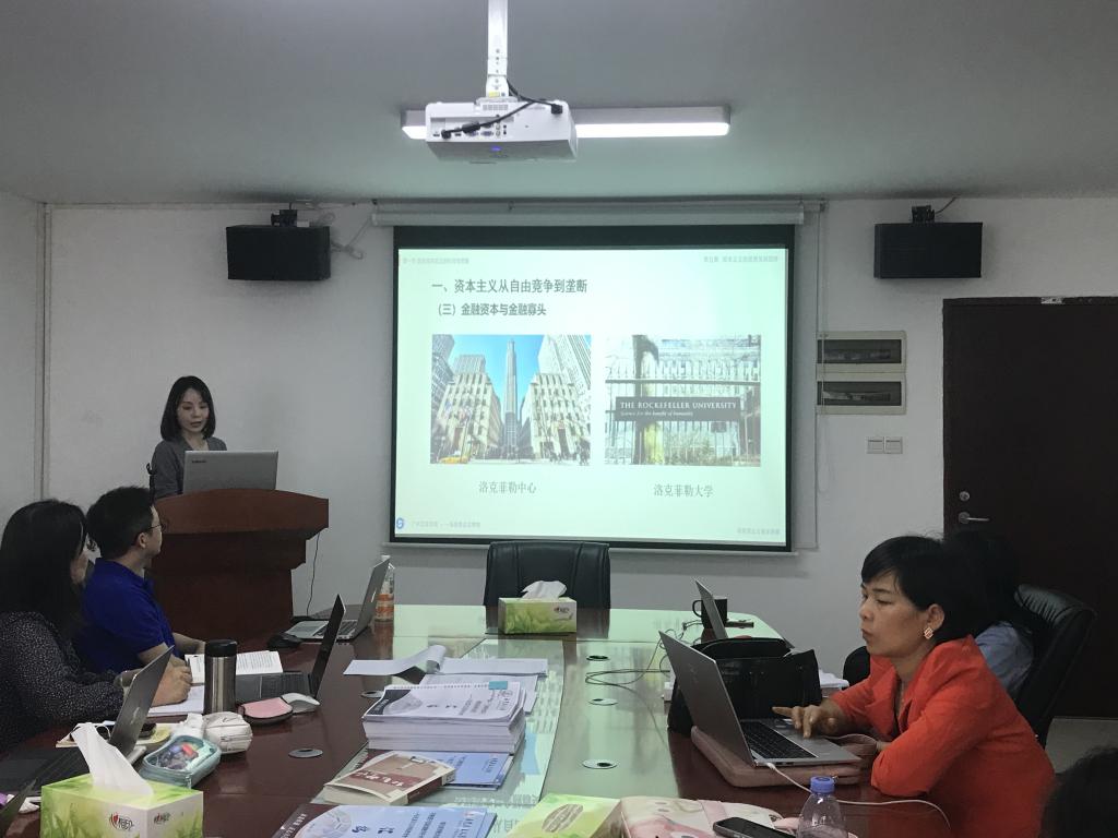 接着,由彭艺格主任进行教学展示。彭艺格主任围绕“垄断资本主义的发展”这一节内容进行了展示。她将教学内容分为“国家垄断资本主义的形成及作用”,“金融垄断资本的发展”“垄断资本向世界范围的扩展”和“垄断资本主义的实质”4个部分进行了讲解。彭老师教学准备充分,对于教材的理解十分透彻,在授课过程中既有对书本知识点的讲解,也由自身思考,理论联系实际,理论回应现实。授课中也设有互动环节,能够充分调动学生的积极性,使学生参与到课堂活动中。