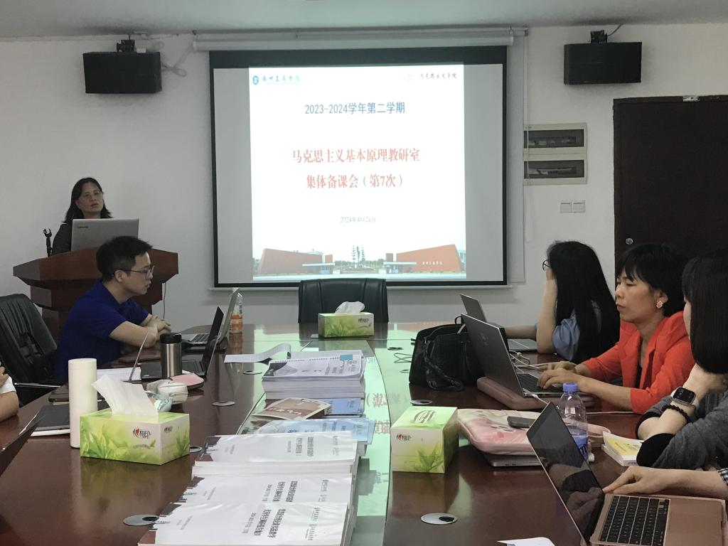 为进一步提升教研室的教学水平,规范教学工作,充分发挥骨干教师的引领、示范作用,进一步提升《马克思主义基本原理》教研室全体教师的教学质量,提升教师的教学水平,增强磨课效果,4月26日下午,马克思主义学院马克思主义基本原理教研室在院部楼424会议室举行了本学期第七次集体备课会,本次会议由教研室主任杨朝辉副教授主持,本学期担任马克思主义基本原理课程的全体教师参加。
