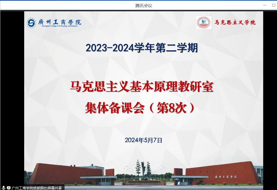 为进一步提升《马克思主义基本原理》课程的教学质量,提高教师团队的教学水平,增强讲课效果。2024年5月7日19:30,马克思主义基本原理教研室通过线上腾讯会议召开本学期第八次集体备课会,会议由马克思主义基本原理教研室主任杨朝晖副教授主持,本学期担任马克思主义基本原理课程教学的全体任课老师参加本次会议。