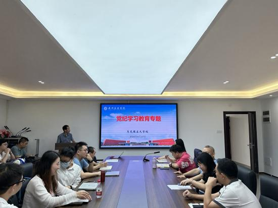 为扎实开展党纪学习教育,引导党员干部进一步学纪、知纪、明纪、守纪,进一步增强学习贯彻《中国共产党纪律处分条例》的政治自觉和思想自觉,2024年6月17日上午,马克思主义学院教师第三党支部在三水校区图书馆张辉名师工作室开展党纪学习教育专题党课。党课由支部书记蔡宗坚副教授主讲,支部全体党员参会。
