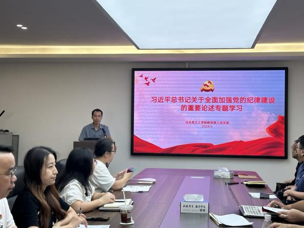 为深入学习党的二十届三中全会精神,贯彻落实习近平新时代中国特色社会主义思想,提升党支部的政治素养和纪律意识,马克思主义学院教师第三党支部于2024年9月5日在三水校区图书馆402张辉名师工作室开展了党纪学习教育专题党课。本次党课围绕习近平总书记关于党的纪律建设的重要论述以及党的二十届三中全会精神展开,旨在深化党员对党纪法规的认识,强化党支部的建设与管理。会议由支部书记蔡宗坚副教授主持,教师第三党支部全体党员教师参会。
