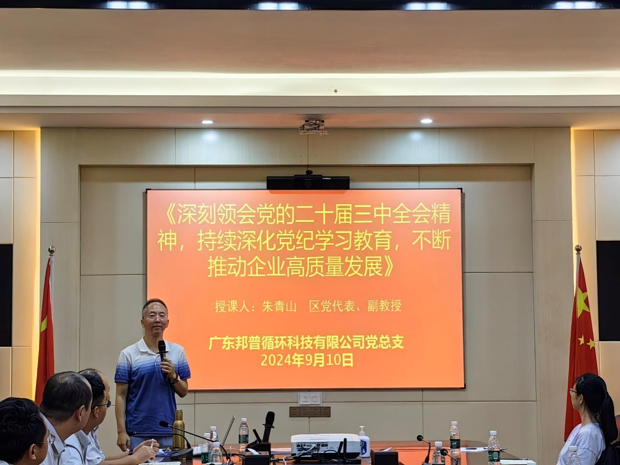 为深入学习党的二十届三中全会精神,学习贯彻习近平新时代中国特色社会主义思想,引导企业党员积极投身企业高质量发展的实践之中,努力构建校企协同发展的命运共同体,ky开元集团官网马克思主义学院党总支与佛高区三水园产业社区党委党建共建举办了学习贯彻党的二十届三中全会精神专题培训班。马克思主义学院宣讲团的专家朱青山副教授于9月10日走进佛山市三水区乐平镇广东邦普循环科技有限公司,进行了主题为《深刻领会党的二十届三中全会精神,持续深化党纪学习教育,不断推动企业高质量发展》的宣讲活动,旨在深入解读党的二十届三中全会精神。