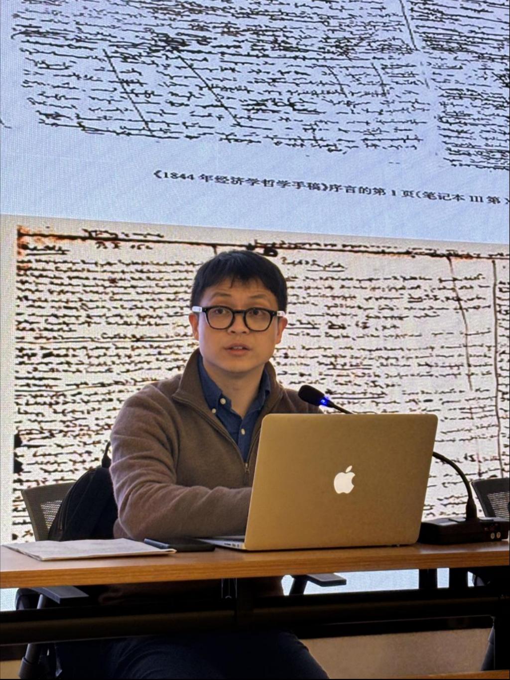 活动伊始,李功清副教授详细介绍了《1844年经济学哲学手稿》的创作历程、历史地位和主体内容,重点对“笔记本I工资”的内容进行深入解读。《1844年经济学哲学手稿》是马克思进行政治经济学和哲学研究的最初成果,是哲学与经济学的第一次结晶,开创了哲学指导下的经济学研究道路以及以经济学为基础的哲学发展道路,马克思的共产主义理论正是以这种结合为基础的。同时,该书也是马克思一生政治经济学批判研究的起始点。李老师指出第一手稿是关于工资、资本的利润、地租的研究和分析;第二手稿是对私有财产及其运动的分析;第三手稿是对私有财产、分工、货币的进一步研究,并由此所引发的马克思的共产主义观念、马克思的历史唯物主义观念以及对黑格尔哲学的系统清理。在文本解读过程中,李老师结合马克思人生经历等具体案例解析,围绕资本家和工人的关系,资本、地租和劳动的变化,供给与需求的关系,价格、价值和物质生活资料之间的联系以及竞争、垄断等方面,指出亚当·斯密学说的矛盾,详细论述了资本主义社会的异化劳动问题。