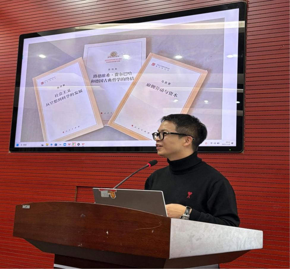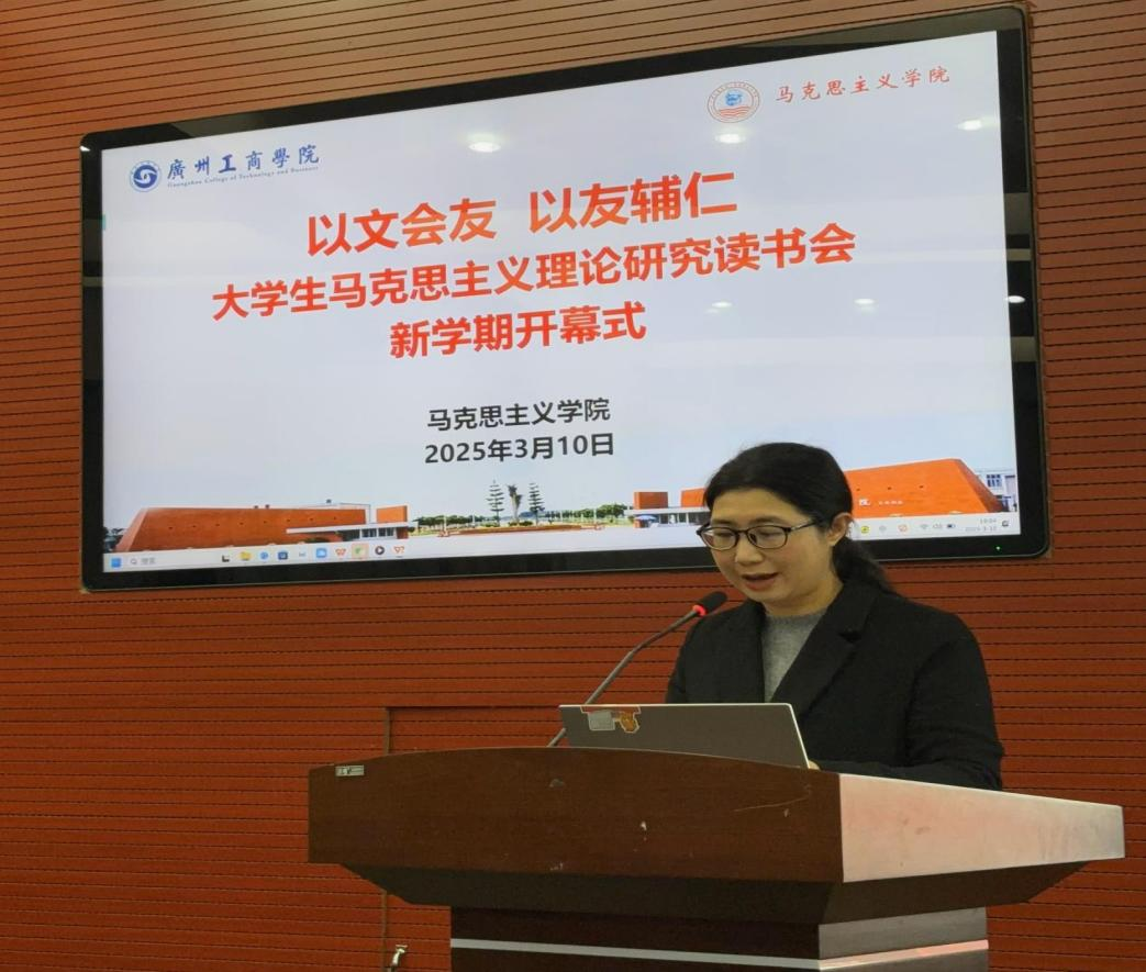开幕式伊始,马克思主义学院院长助理谭丽婷副教授致辞,她指出了举办读书会旨在为师生创建一个深度研习、交流、互鉴的优质平台,希望同学们运用辩证唯物主义和历史唯物主义的方法,正确认识社会发展的规律,坚定中国特色社会主义道路自信、理论自信、制度自信、文化自信。同时,她对读书会的同学们提出了三点建议:一是保持专注与热情,马克思主义理论是深沉且厚重的,需要全身心投入研究,以持续的热情攻坚克难。二是养成思考与质疑的习惯,对经典理论深入思考,敢于提出疑问,在实践中深化认识。三是注意理论联系实际,积极将马克思主义理论运用到日常学习、社会实践中,用其立场、观点、方法解决现实问题,真正做到学以致用。