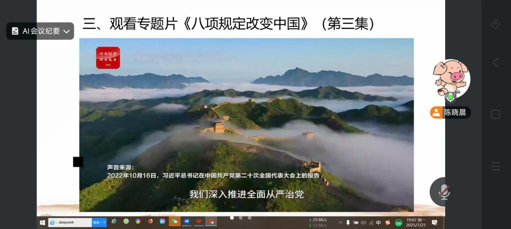 为扎实开展深入贯彻中央八项规定精神学习教育,加强基层党建,促进支部作风建设,7月21日,马克思主义学院教师第二党支部在线上召开党员大会。会议由支部书记陈晓晨副教授主持,支部全体党员教师参加。