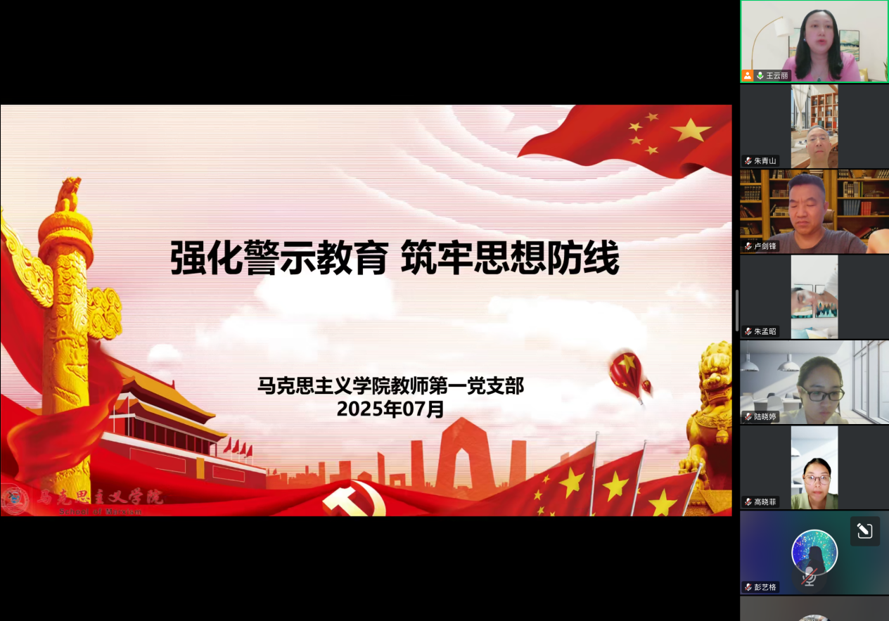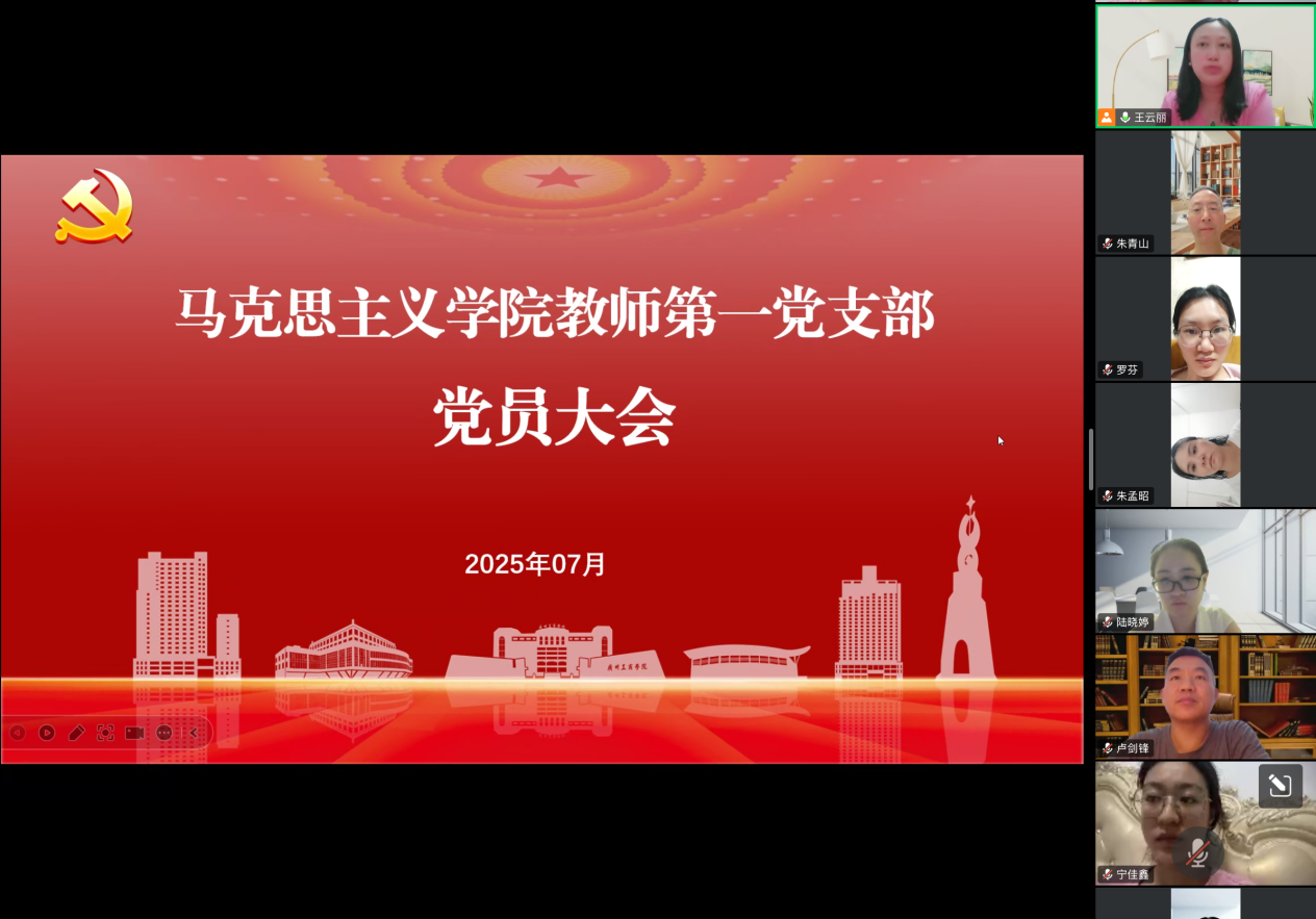 为深入贯彻中央八项规定精神学习教育,加强党员队伍建设,提升党员思想政治素质,马克思主义学院教师第一党支部于7月24日线上召开党员大会。会议由支部书记王云丽副教授主持,支部全体党员教师参加。本次大会内容丰富、务实高效,涵盖了学习研讨、集中学习、警示教育等重要环节。